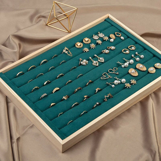 Wooden Velvet Jewelry Box - Green/Beige - Gift Box for Rings, Earrings, Bracelets